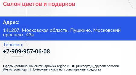 Салон цветов и подарков по адресу 141207, Московская область, Пушкино, Московский проспект, 43а в дальнейшем Организация, размещена в следующих категориях: