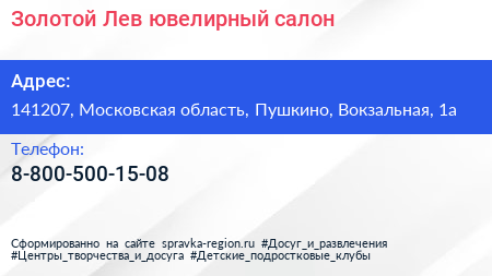 Золотой Лев, ювелирный салон по адресу 141207, Московская область, Пушкино, Вокзальная, 1а в дальнейшем Организация, размещена в следующих категориях: