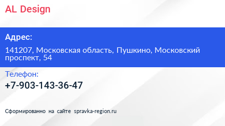 AL Design по адресу 141207, Московская область, Пушкино, Московский проспект, 54 в дальнейшем Организация, размещена в следующих категориях: