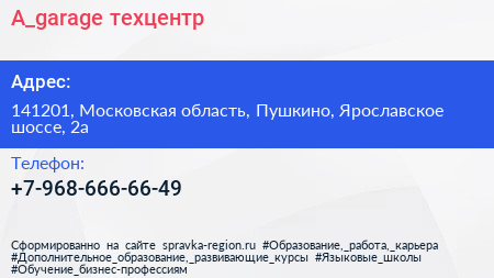 A_garage, техцентр по адресу 141201, Московская область, Пушкино, Ярославское шоссе, 2а в дальнейшем Организация, размещена в следующих категориях:
