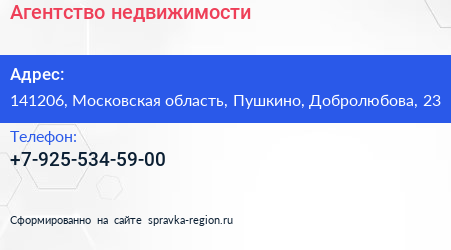 Агентство недвижимости по адресу 141206, Московская область, Пушкино, Добролюбова, 23 в дальнейшем Организация, размещена в следующих категориях: