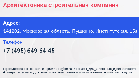Архитектоника, строительная компания по адресу 141202, Московская область, Пушкино, Институтская, 15а в дальнейшем Организация, размещена в следующих категориях: