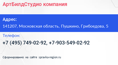 АртБилдСтудио, компания по адресу 141207, Московская область, Пушкино, Грибоедова, 5 в дальнейшем Организация, размещена в следующих категориях: