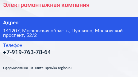 Электромонтажная компания по адресу 141207, Московская область, Пушкино, Московский проспект, 52/2 в дальнейшем Организация, размещена в следующих категориях: