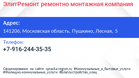 ЭлитРемонт, ремонтно-монтажная компания по адресу 141206, Московская область, Пушкино, Лесная, 5 в дальнейшем Организация, размещена в следующих категориях: