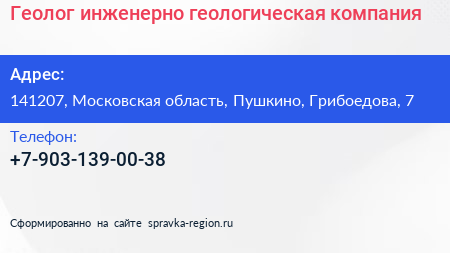 Геолог, инженерно-геологическая компания по адресу 141207, Московская область, Пушкино, Грибоедова, 7 в дальнейшем Организация, размещена в следующих категориях: