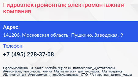 Гидроэлектромонтаж, электромонтажная компания по адресу 141206, Московская область, Пушкино, Заводская, 9 в дальнейшем Организация, размещена в следующих категориях: