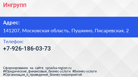Ингрупп по адресу 141207, Московская область, Пушкино, Писаревская, 2 в дальнейшем Организация, размещена в следующих категориях: