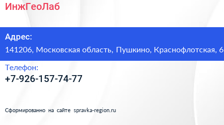 ИнжГеоЛаб по адресу 141206, Московская область, Пушкино, Краснофлотская, 6 в дальнейшем Организация, размещена в следующих категориях:
