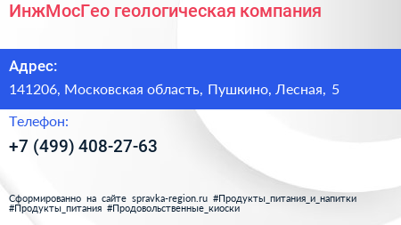 ИнжМосГео, геологическая компания по адресу 141206, Московская область, Пушкино, Лесная, 5 в дальнейшем Организация, размещена в следующих категориях: