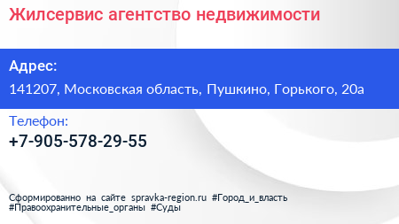 Жилсервис, агентство недвижимости по адресу 141207, Московская область, Пушкино, Горького, 20а в дальнейшем Организация, размещена в следующих категориях: