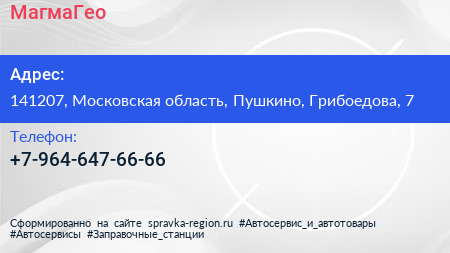 МагмаГео по адресу 141207, Московская область, Пушкино, Грибоедова, 7 в дальнейшем Организация, размещена в следующих категориях:
