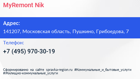 MyRemont-Nik по адресу 141207, Московская область, Пушкино, Грибоедова, 7 в дальнейшем Организация, размещена в следующих категориях: