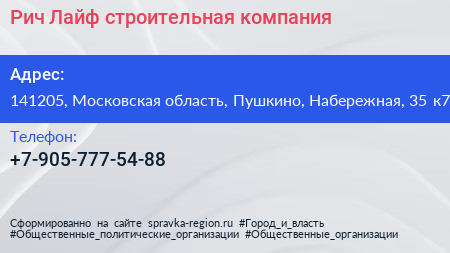 Рич Лайф, строительная компания по адресу 141205, Московская область, Пушкино, Набережная, 35 к7 в дальнейшем Организация, размещена в следующих категориях: