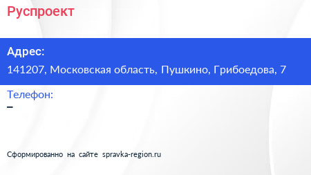 Руспроект по адресу 141207, Московская область, Пушкино, Грибоедова, 7 в дальнейшем Организация, размещена в следующих категориях: