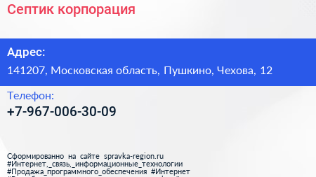 Септик, корпорация по адресу 141207, Московская область, Пушкино, Чехова, 12 в дальнейшем Организация, размещена в следующих категориях: