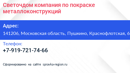Светочдом, компания по покраске металлоконструкций по адресу 141206, Московская область, Пушкино, Краснофлотская, 6 в дальнейшем Организация, размещена в следующих категориях: