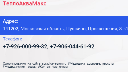 ТеплоАкваМакс по адресу 141202, Московская область, Пушкино, Просвещения, 8 к1 в дальнейшем Организация, размещена в следующих категориях:
