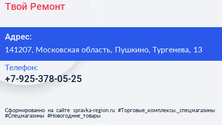 Твой Ремонт по адресу 141207, Московская область, Пушкино, Тургенева, 13 в дальнейшем Организация, размещена в следующих категориях: