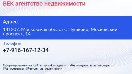 ВЕК, агентство недвижимости по адресу 141207, Московская область, Пушкино, Московский проспект, 14 в дальнейшем Организация, размещена в следующих категориях:
