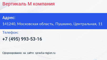 Вертикаль-М, компания по адресу 141240, Московская область, Пушкино, Центральная, 11 в дальнейшем Организация, размещена в следующих категориях: