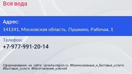 Вся вода по адресу 141241, Московская область, Пушкино, Рабочая, 1 в дальнейшем Организация, размещена в следующих категориях: