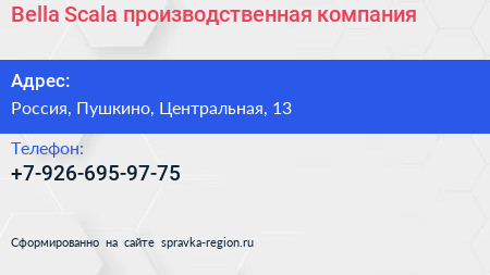 Bella Scala, производственная компания по адресу Интеррыбпродукт, 7, Центральная улица, ВИНГС-М, Лесные Поляны, Пушкинский городской округ, Московская область, Центральный федеральный округ, 141212, Россия в дальнейшем Организация, размещена в следующих категориях: