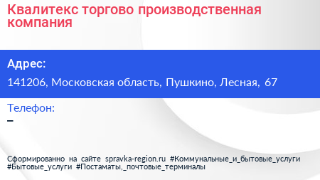 Квалитекс, торгово-производственная компания по адресу 141206, Московская область, Пушкино, Лесная, 67 в дальнейшем Организация, размещена в следующих категориях: