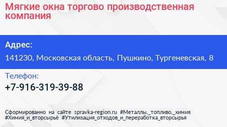 Мягкие окна, торгово-производственная компания по адресу 141230, Московская область, Пушкино, Тургеневская, 8 в дальнейшем Организация, размещена в следующих категориях: