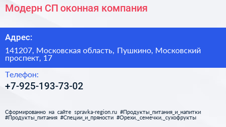 Модерн-СП, оконная компания по адресу 141207, Московская область, Пушкино, Московский проспект, 17 в дальнейшем Организация, размещена в следующих категориях: