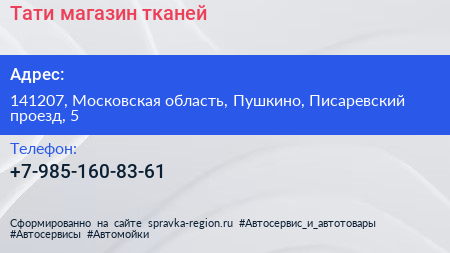 Тати, магазин тканей по адресу 141207, Московская область, Пушкино, Писаревский проезд, 5 в дальнейшем Организация, размещена в следующих категориях:
