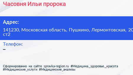 Часовня Ильи пророка по адресу 141230, Московская область, Пушкино, Лермонтовская, 20 ст2 в дальнейшем Организация, размещена в следующих категориях: