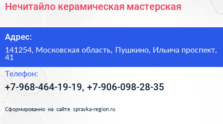 Нечитайло, керамическая мастерская по адресу 141254, Московская область, Пушкино, Ильича проспект, 41 в дальнейшем Организация, размещена в следующих категориях: