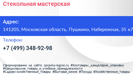 Стекольная мастерская по адресу 141205, Московская область, Пушкино, Набережная, 35 к7 в дальнейшем Организация, размещена в следующих категориях:
