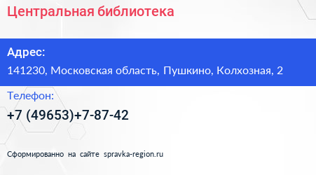 Центральная библиотека по адресу 141230, Московская область, Пушкино, Колхозная, 2 в дальнейшем Организация, размещена в следующих категориях: