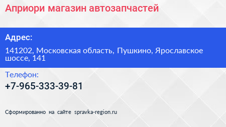 Априори, магазин автозапчастей по адресу 141202, Московская область, Пушкино, Ярославское шоссе, 141 в дальнейшем Организация, размещена в следующих категориях: