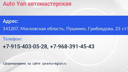 Auto.Yan, автомастерская по адресу 141207, Московская область, Пушкино, Грибоедова, 23 ст1 в дальнейшем Организация, размещена в следующих категориях: