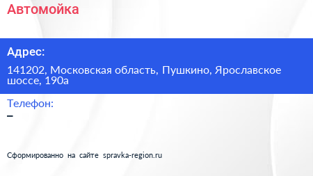Автомойка по адресу 141202, Московская область, Пушкино, Ярославское шоссе, 190а в дальнейшем Организация, размещена в следующих категориях: