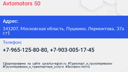 Avtomotors-50 по адресу 141207, Московская область, Пушкино, Лермонтова, 37а ст1 в дальнейшем Организация, размещена в следующих категориях: