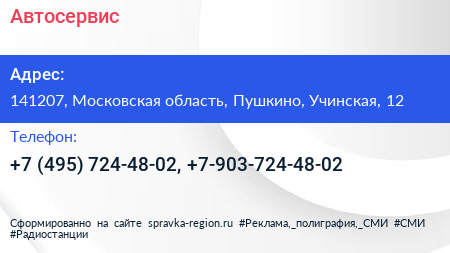 Автосервис по адресу 141207, Московская область, Пушкино, Учинская, 12 в дальнейшем Организация, размещена в следующих категориях: