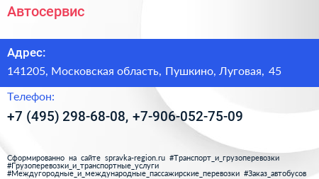 Автосервис по адресу 141205, Московская область, Пушкино, Луговая, 45 в дальнейшем Организация, размещена в следующих категориях: