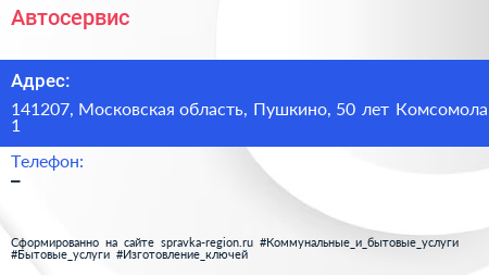 Автосервис по адресу 141207, Московская область, Пушкино, 50 лет Комсомола, 1 в дальнейшем Организация, размещена в следующих категориях: