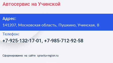 Автосервис на Учинской по адресу 141207, Московская область, Пушкино, Учинская, 8 в дальнейшем Организация, размещена в следующих категориях: