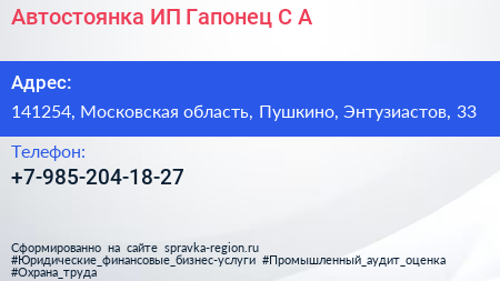 Автостоянка, ИП Гапонец С.А. по адресу 141254, Московская область, Пушкино, Энтузиастов, 33 в дальнейшем Организация, размещена в следующих категориях: