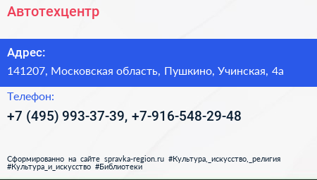Автотехцентр по адресу 141207, Московская область, Пушкино, Учинская, 4а в дальнейшем Организация, размещена в следующих категориях: