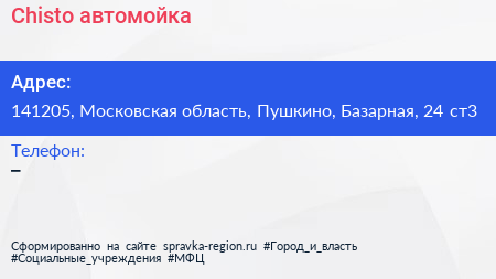 Chisto, автомойка по адресу 141205, Московская область, Пушкино, Базарная, 24 ст3 в дальнейшем Организация, размещена в следующих категориях: