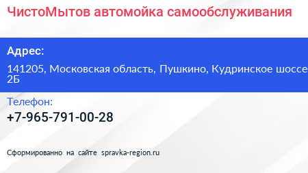 ЧистоМытов, автомойка самообслуживания по адресу 141205, Московская область, Пушкино, Кудринское шоссе, 2Б в дальнейшем Организация, размещена в следующих категориях: