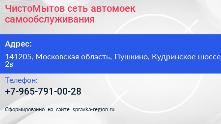 ЧистоМытов, сеть автомоек самообслуживания по адресу 141205, Московская область, Пушкино, Кудринское шоссе, 2в в дальнейшем Организация, размещена в следующих категориях: