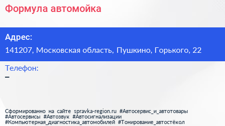 Формула, автомойка по адресу 141207, Московская область, Пушкино, Горького, 22 в дальнейшем Организация, размещена в следующих категориях: