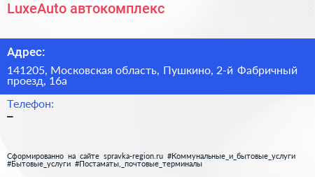 LuxeAuto, автокомплекс по адресу 141205, Московская область, Пушкино, 2-й Фабричный проезд, 16а в дальнейшем Организация, размещена в следующих категориях: